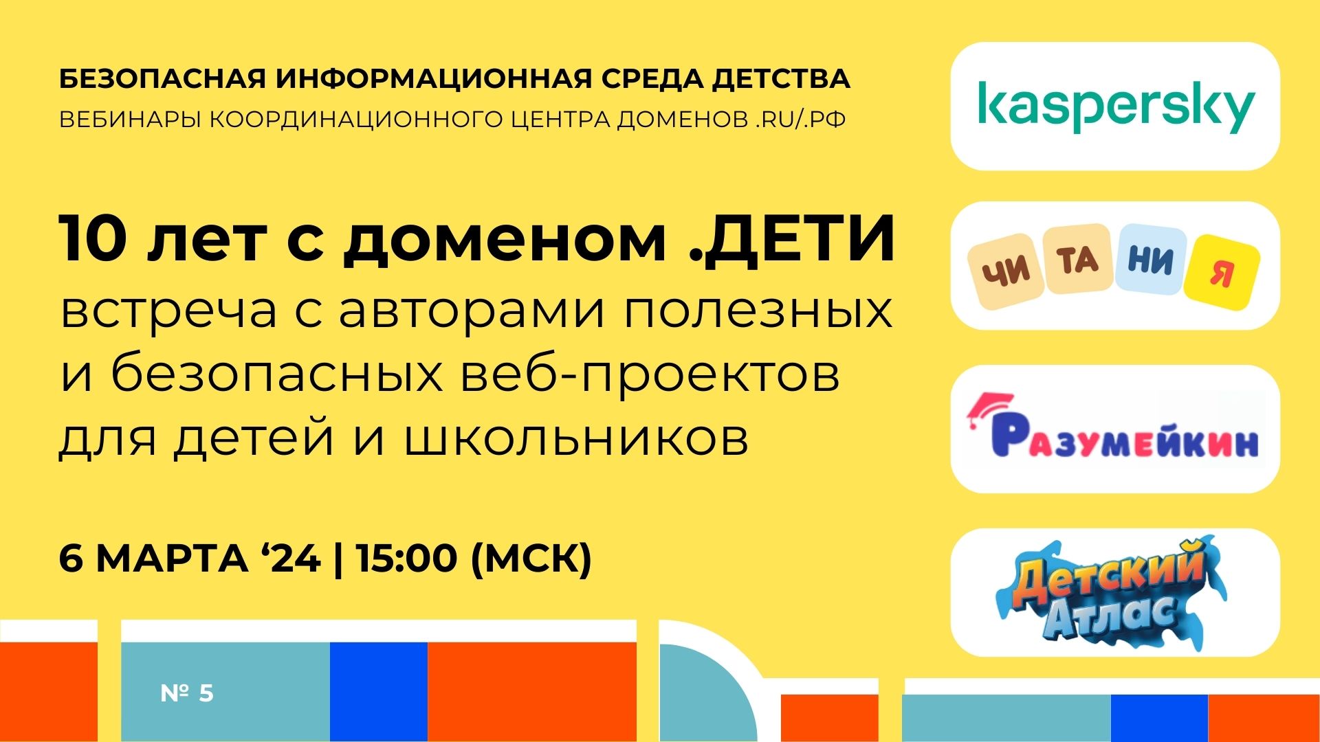 6 марта в 15:00 (МСК) на VK-площадке проекта «Безопасная информационная среда детства» пройдет пятый вебинар Координационного центра .RU/.РФ «10 лет с доменом .ДЕТИ». Гостями эфира станут авторы полезных и безопасных ресурсов для детей и школьников, созданных в этом интернет-пространстве.